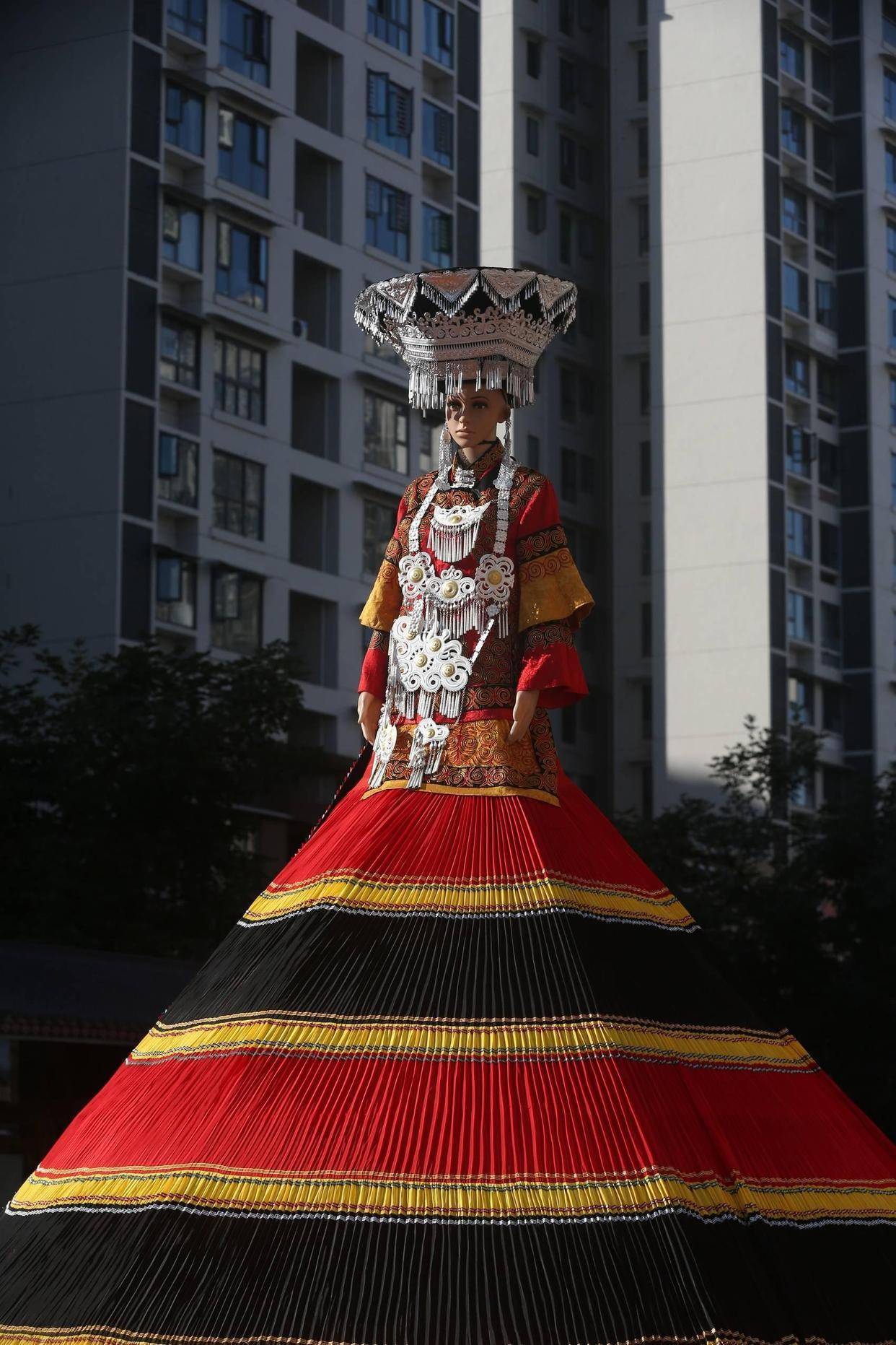 如今,设计师们也在尝试将彝族服饰元素提炼出来,融入现代时装设计。宽松的裙摆、精美的刺绣时常出现在T台上,走向更广阔的世界。